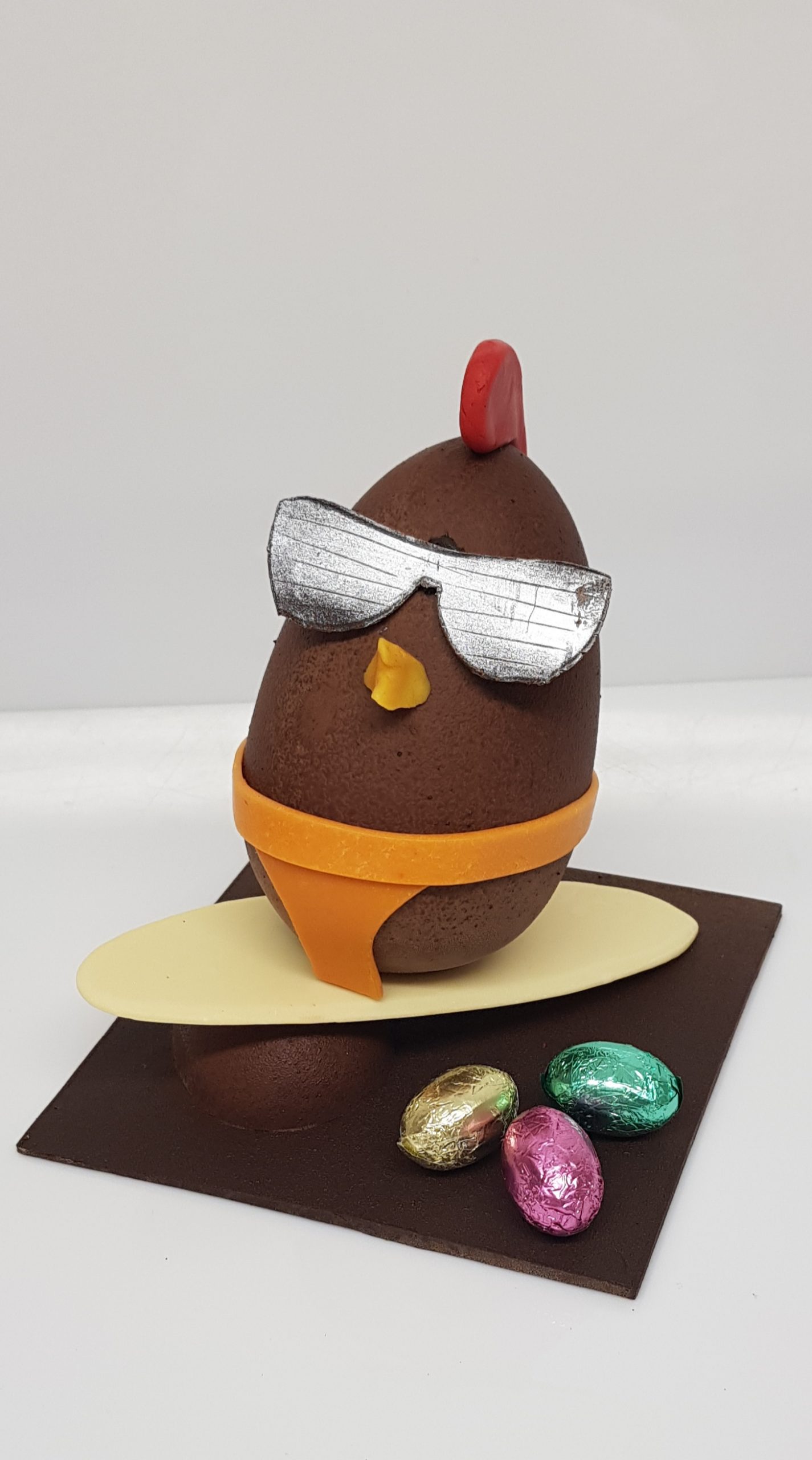 Notre œuf au chocolat au lait a revêtu son plus beau slip de bain orange , ses lunettes de soleil et part surfer sur la vague ! planche de surf en chocolat blanc, oeuf au chocolat au lait , support en chocolat noir – un sachet de petits oeufs praliné 100gr ou de friture 100gr est fourni (selon disponibilité)
